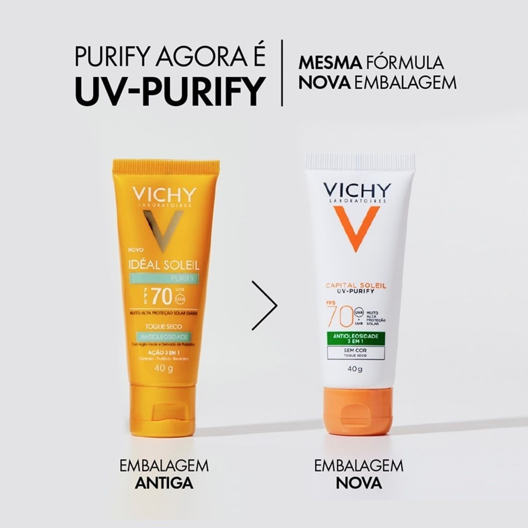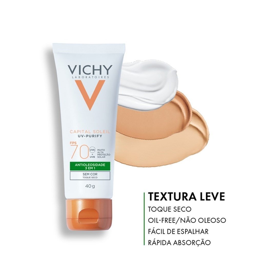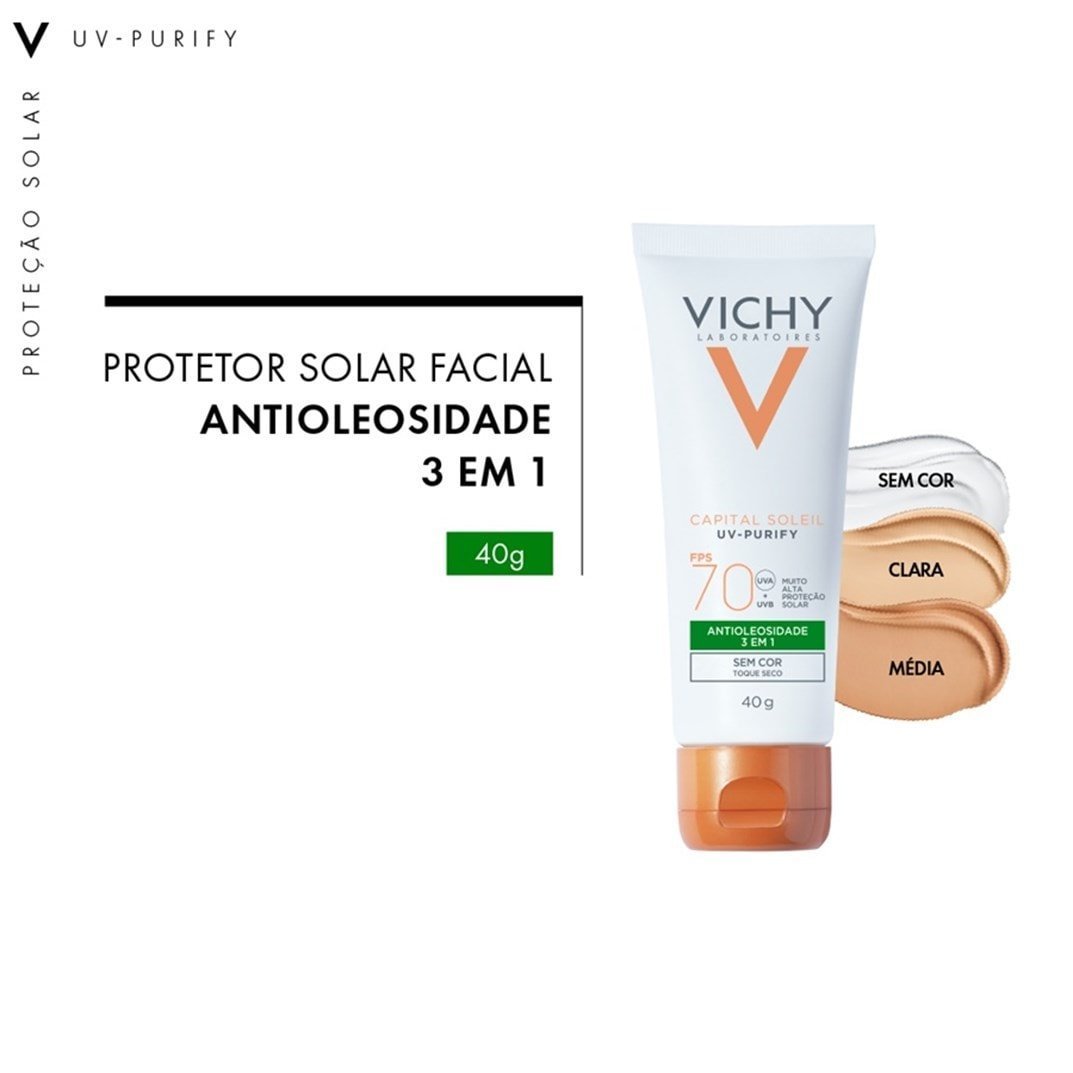 Protetor solar facial sem cor. Vichy Purify FPS 70 é ideal para conferir alta proteção contra os raios UVA e UVB, ao mesmo tempo que controla a oleosidade excessiva.
