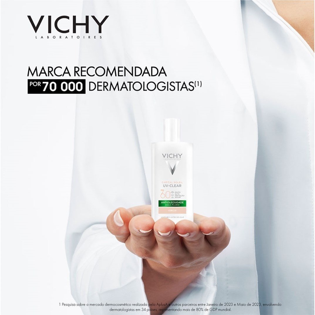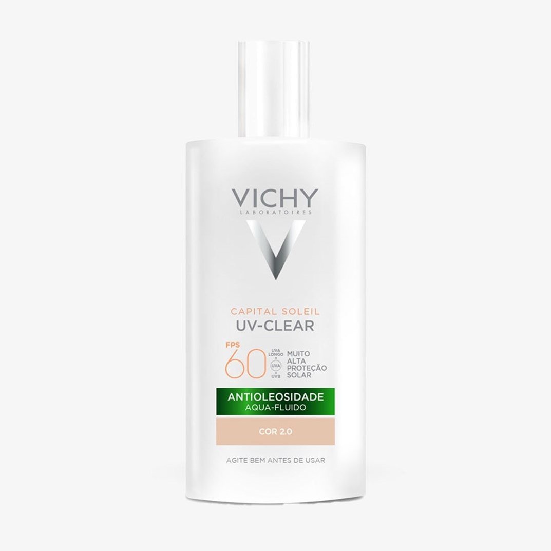 Protetor solar para peles oleosas. Vichy Capital Soleil UV Clear FPS60 conta com textura aqua-fluida, reduz a produção de oleosidade por horas.